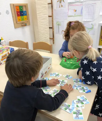 Durch das Rollen- oder Theaterspiel lernen sie vielfältige nonverbale Ausdrucksformen (Körpersprache, Mimik). Die Kinder nehmen Kontakt zu anderen auf und gestalten ihren eigenen Tag. Sie tragen Konflikte aus, schließen Kompromisse und erlernen Toleranz bei Tischspielen - auch z. B. Durchhaltevermögen, wenn sie ein Spiel zu Ende spielen, oder dass auch Verlieren zum Spiel gehört und dies nicht schlimm ist.